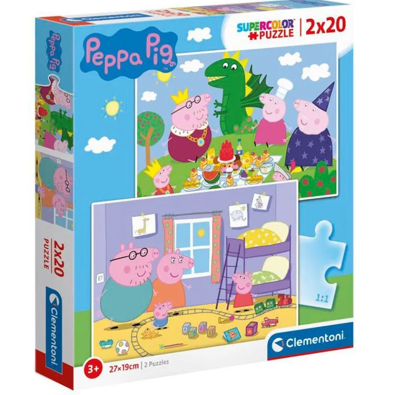 Conjunto de 2 puzzles compuestos de 20 piezas cada uno con los que podrás montar imágenes inspiradas en la serie de animación Peppa Pig.