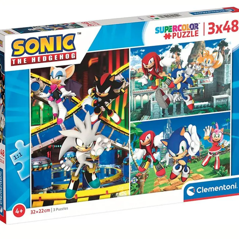 Pack que se compone de 3 puzzles de 48 piezas, cada uno, con las que podrás construir imágenes inspiradas en el famoso videojuego Sonic. Su tamaño es de 32 cm x 22 cm aproximadamente. Recomendado a partir de 4 años.