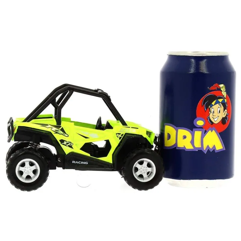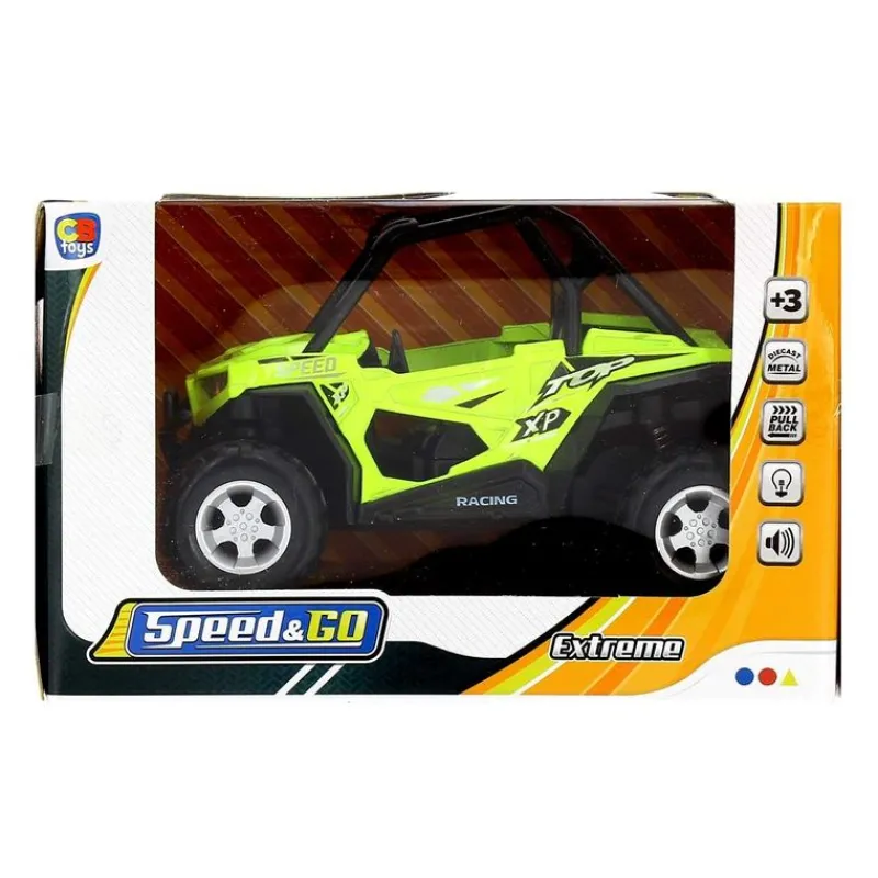 Vehículo Cross Country de color verde. Hecho de metal y con una escala de 1:22. Reproduce sonidos y luces. Funciona con sistema de fricción. Recomendado a partir de 3 años.