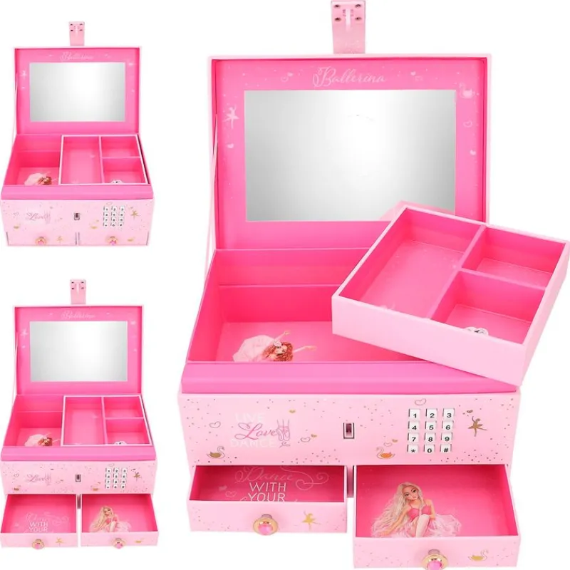 Dispone de un espejo en el interior de la tapa plegable, una bandeja extraíble con 3 compartimentos y 2 cajoncitos con tiradores adornados con brillantes. Sus dimensiones son de 12.5 cm x 20 cm x 15.7 cm aproximadamente.