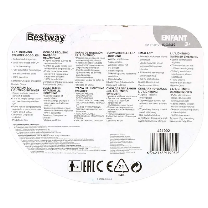 Gafas de color infantiles de color azul. Tienen piezas oculares suaves y que permiten un cómodo ajuste. Disponen de cristales con revestimiento protector UV que ofrece gran campo de visión. El puente nasal es completamente ajustable y se puede ajustar a la cabeza gracias a su tira de silicona. Recomendado a partir de 3 años.