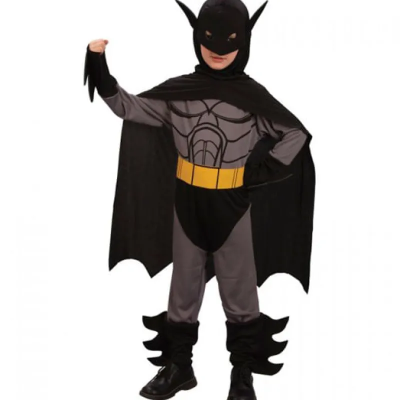 Disfraz de súper héroe murciélago infantil que incluye capa negra con capucha y máscara, mono de cuerpo entero y cinturón.