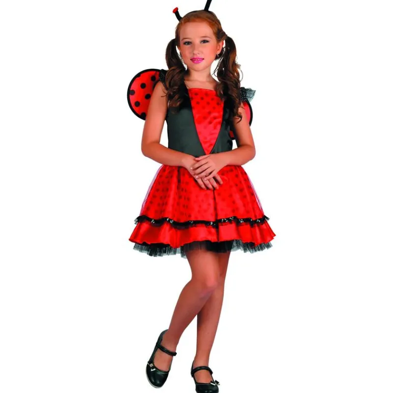 Disfraz de coqueta mariquita. Se compone de un vestido rojo con detalles en negro, alas a conjunto y accesorio para la cabeza. NO incluye calzado. Talla M (Altura 120-130cm, pecho 67cm, cintura 60cm, 6-8 años) orientación aproximada.