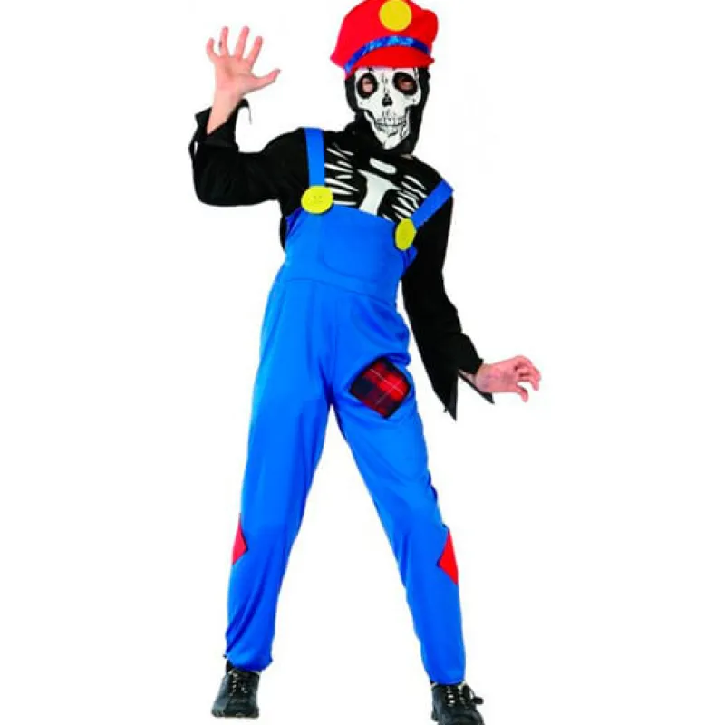Disfraz de fontanero malvado que te incluye camiseta de esqueleto, capucha con cara de esquleto, mono azul y gorra.