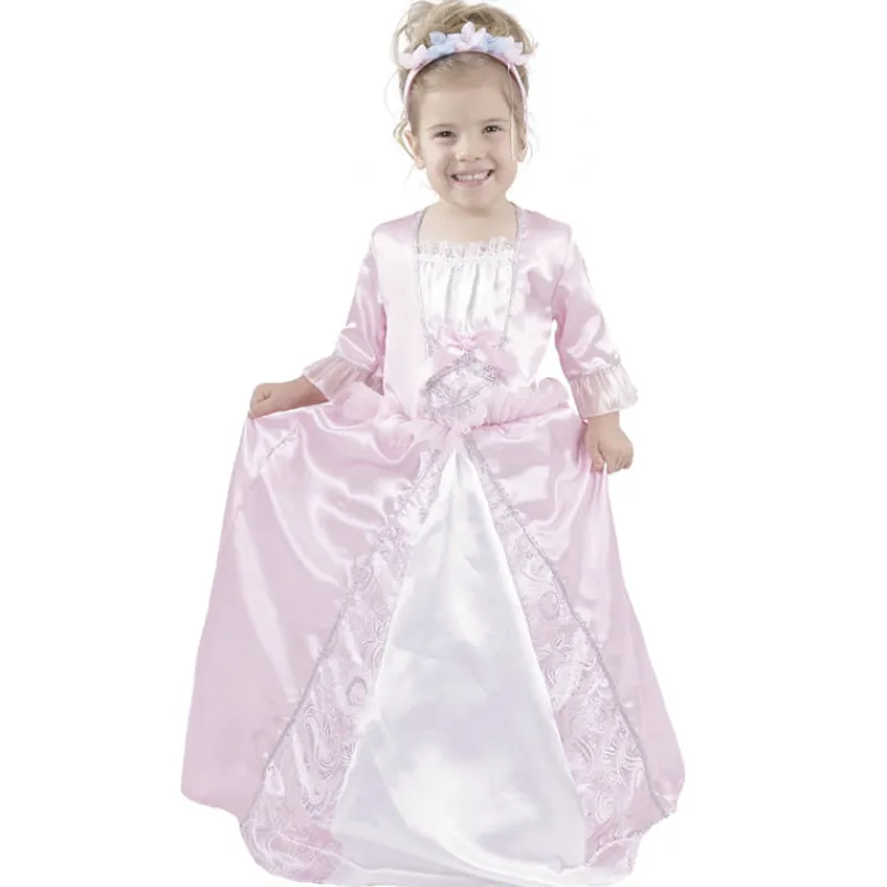Bonito disfraz de hada compuesto por vestido largo y diadema de flores. El vestido es en tonos rosas y blancos.