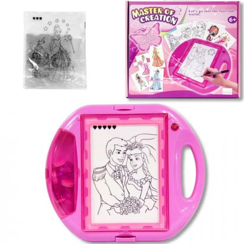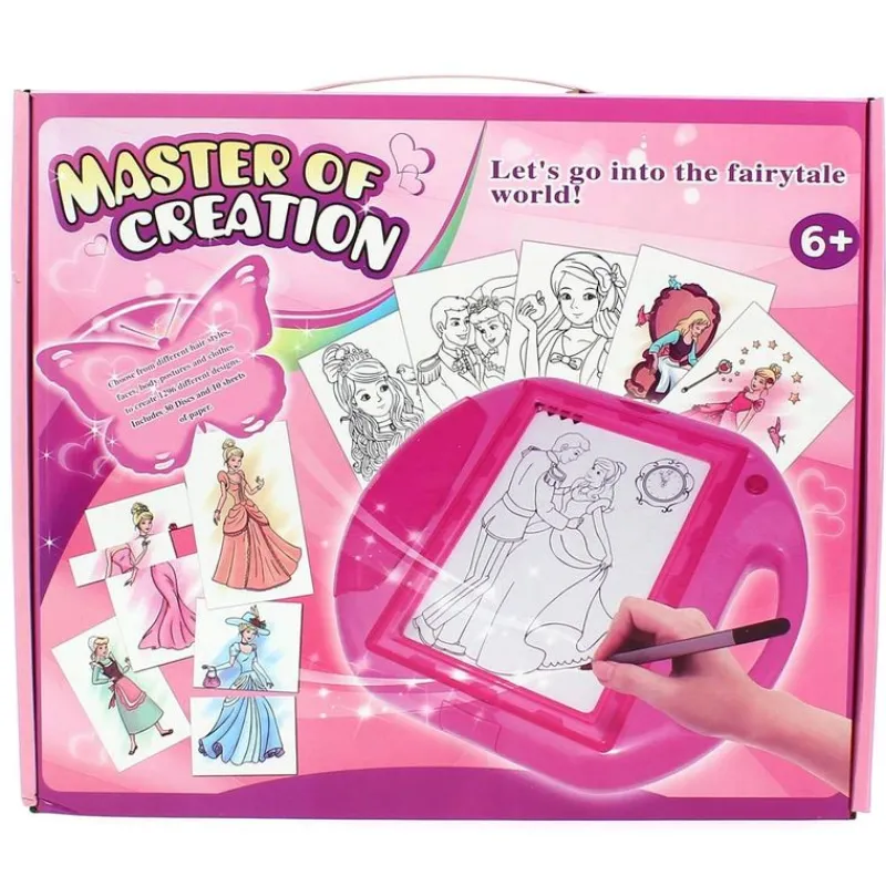 ¡Crea tu propio mundo de ensueño! Con esta pizarra con luz podrás crear tus propios diseños, desde el estilo de peinado, las caras, los cuerpos, las posturas y la ropa ¡Hay 1296 diseños diferentes! Incluye 30 discos y 10 láminas de papel. Funciona con 3 pilas AA NO incluidas. Recomendado a partir de 6 años.