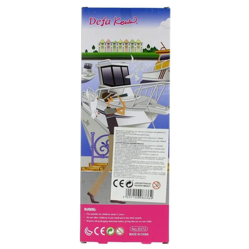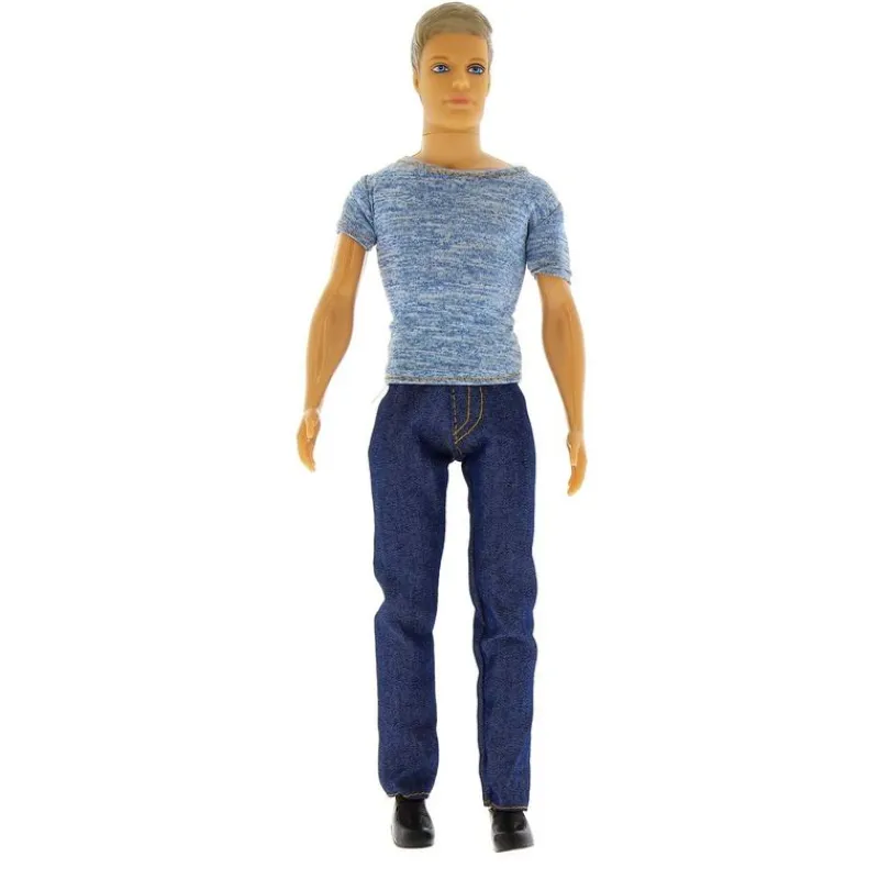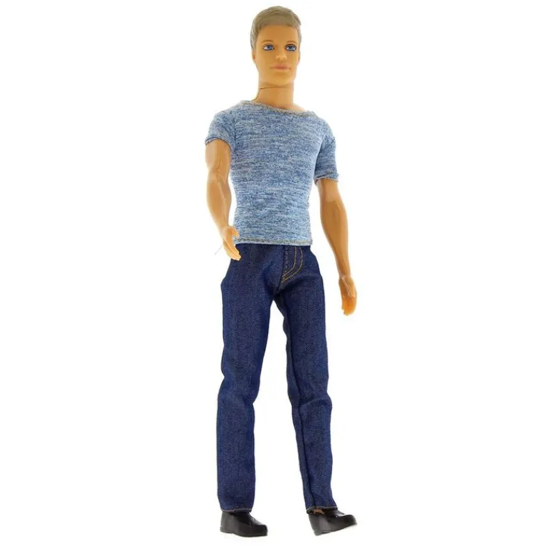 Muñeco Defa Kevin vestido con un look arreglado pero informal, con unos vaqueros largos y una camiseta con efecto de aguas. El muñeco Defa Kevin lleva un llamativo tupé, es articulado y mide, aproximadamente, 30 cm.