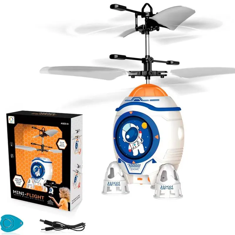 Helicóptero volador de juguete con diseño futurista y temático espacial.