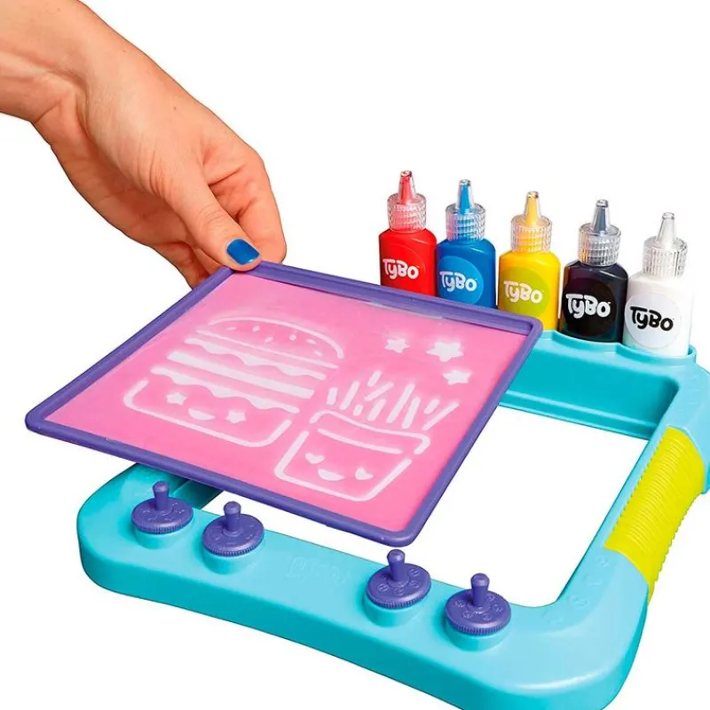 Divertido estudio con el que podrás iniciarte a la impresión en tela. Podrás transformar cualquier cosa, desde camisetas hasta bolsas de lona y personalizarlas como a ti más te guste. Escoge entre las plantillas la que quieres plasmar, decide qué pintura de tela quieres utilizar, utiliza el deslizador para imprimir y decora con los diferentes sellos de forma. Recomendado a partir de 6 años.