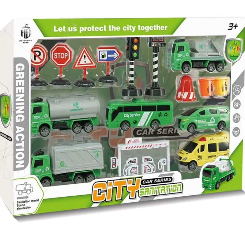 Pack en el que encontrarás 5 vehículos inspirados en transporte y diferentes tipos de camiones de limpieza.