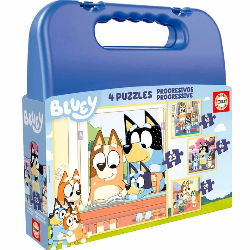 Maletín en el que encontrarás 4 puzzles con diseños inspirados en la serie de animación Bluey. Los puzles son progresivos, por lo que constan de 12, 16,20 y 25 piezas.