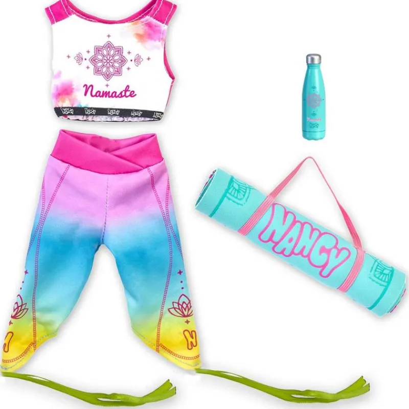 Pack de la colección Nancy en el que encontrarás todo lo que la muñeca necesita para un día de yoga. Contiene un top y mallas, una esterilla y una botella de agua. Recomendado a partir de 3 años.