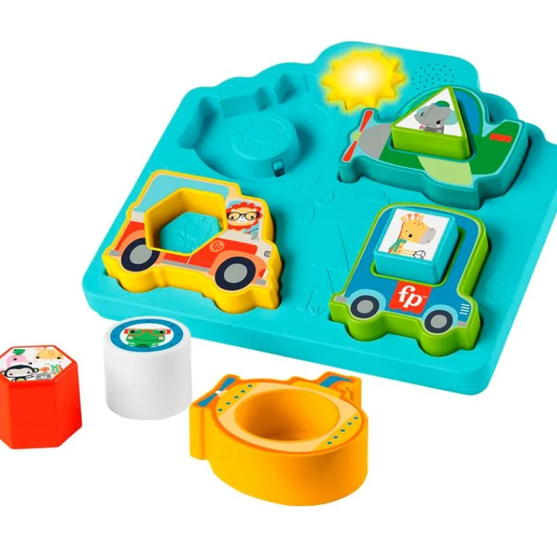 Rompecabezas de vehículos y formas con sonidos de la colección Fisher Price. Enseñará a los más pequeños de la casa a clasificar las formas y fomentar el desarrollo de habilidades. Tu bebé escuchará sonidos divertidos de vehículos y animales, así como también verá luces, cada vez que coloque una pieza del rompecabezas correctamente. Al pulsar el botón del sol, se activan sonidos adicionales que hacen trabajar la motricidad fina. Funciona con 2 pilas AAA incluidas (pilas de demostración). Recomendado a partir de 9 meses.