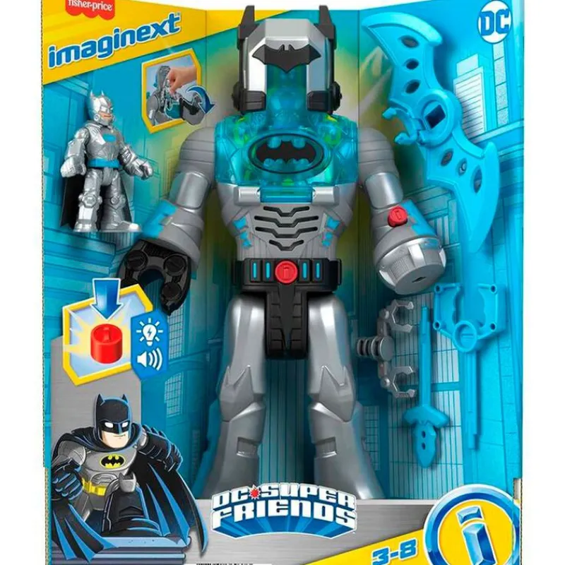 Cuando Gotham City necesita protección a lo grande Batman saca su arma más potente. Coloca la figura de Batman o Joker en el interior de la cabina del exotraje, pulsa el botón para activar las luces y sonidos increíbles. También incluye un botón que, al pulsarlo, dispara proyectiles para detener a los villanos. El exotraje tiene un tamaño de 30 cm aproximadamente. Viene acompañado de una pequeña figura de Batman o Joker, 2 proyectiles y accesorios. Funciona con 3 pilas LR44 incluidas (pilas de demostración). Recomendado a partir de 3 años.