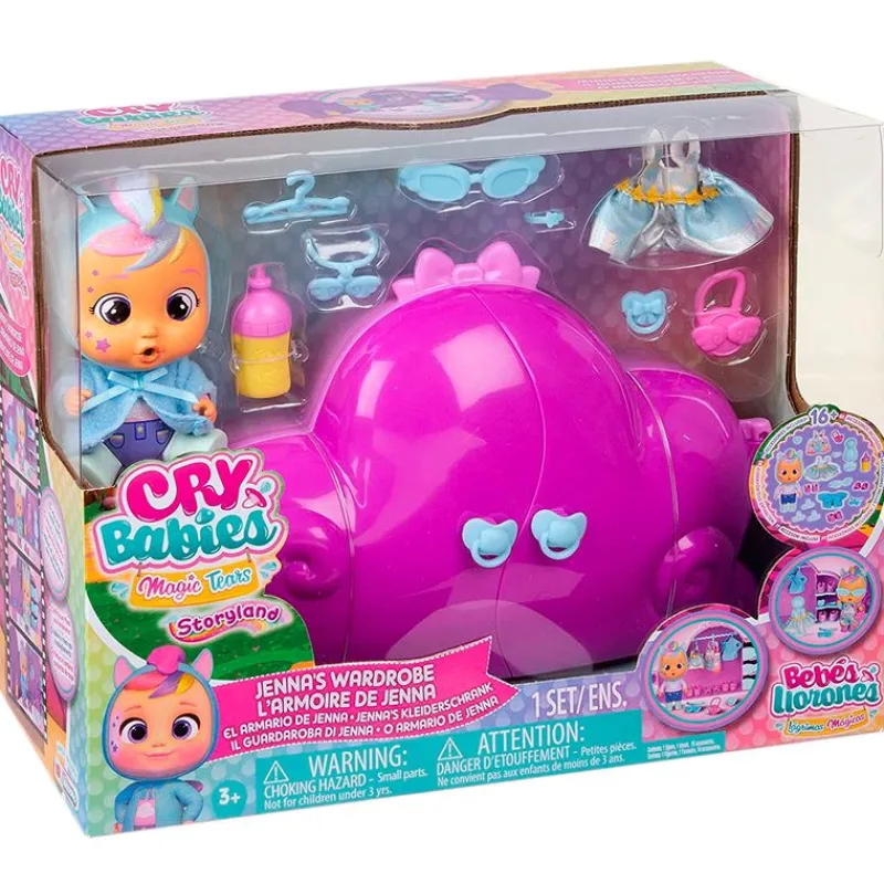 ¡El armario de Jenna está lleno de sorpresas para ti! Contiene perchas y espacios para los zapatos, lugares para los accesorios y la ropa de los bebés llorones. Incluye 16 sorpresas y accesorios compatibles con los bebés llorones lágrimas mágicas (pequeños). Viene acompañada de una mini muñeca exclusiva de Jenna ¡Llora lágrimas de verdad! Recomendado a partir de 3 años.