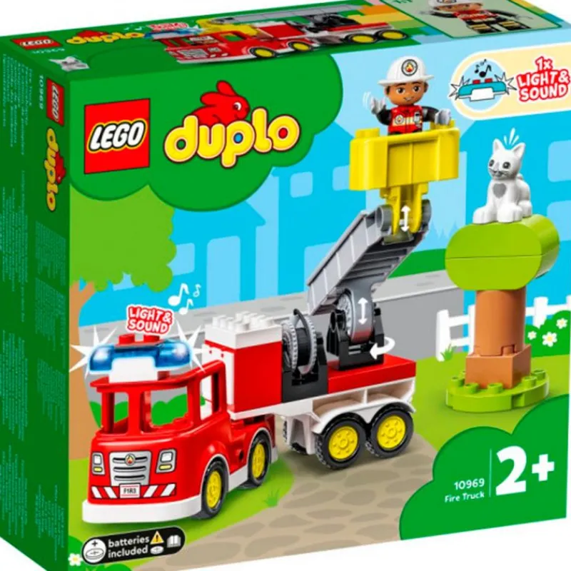 Pack de la colección Lego Duplo, compuesto de 21 piezas, con las que los más pequeños de la casa podrán montar su camión de bomberos. El camión reproduce sonidos y luces (pilas de demostración incluidas). Contiene un personaje de la colección LEGO Duplo y un gatito al que rescatar el árbol. La escalera del camión es móvil. Recomendado a partir de 2 años.