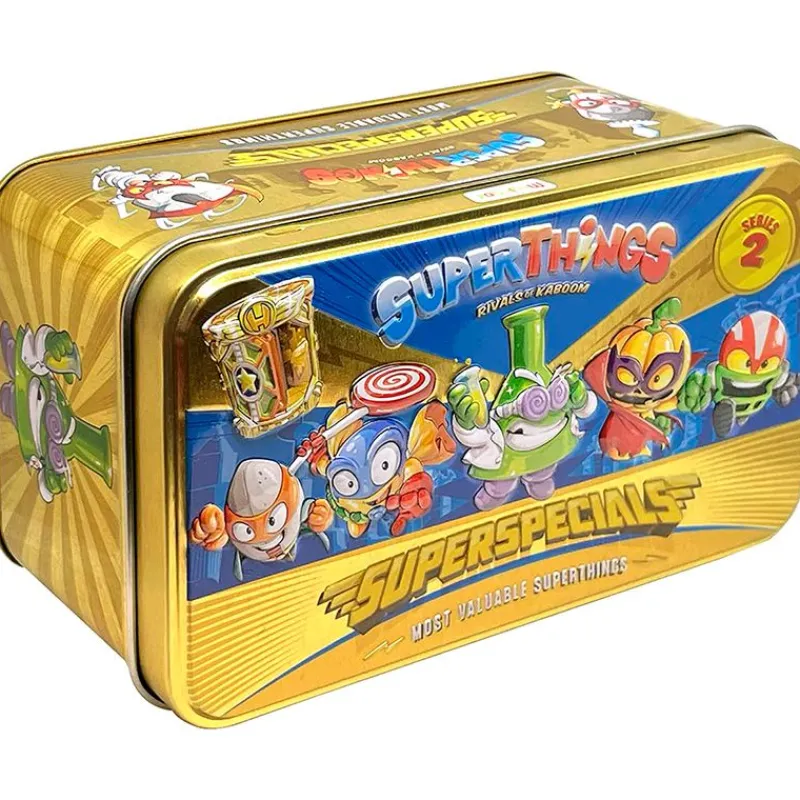 Lata Gold Superspecials de la colección Supethings ¡Consigue los 9 Supethings exclusivos de la serie 2! En el interior encontrarás al Professor K (ultrararo), Candy Strike y PumpKing (dorados), Turbo Twist, Super Riff, Rocketball, Headstrong, Lord Twister y Beatcrush. Además es una oportunidad única para conseguir las 2 guaridas doradas de héroe y villano.