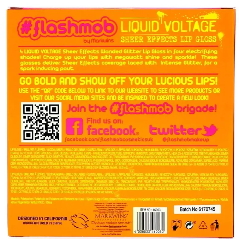 Da un toque final de luz y brillo a tus labios con estos lip gloss y consigue un resultado de alto voltaje. El pack Liquid Voltage de Flashmob contiene 4 lip gloss de distintos colores con efecto brillo. Aplícalos sobre tus labios, después de haber utilizado tu barra labial habitual, para conseguir un efecto chispeante. Peso Neto de los 4 pintalabios: 11,20 gramos/ml.