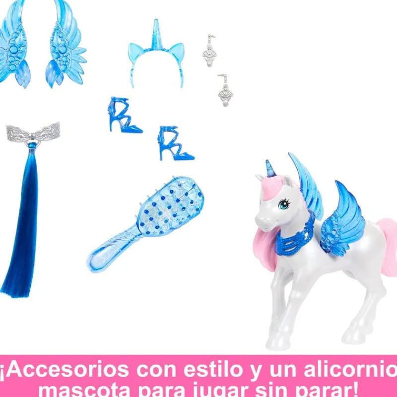 Muñeca Barbie Hadacornio Zafiro, inspirada en la serie de animación Barbie un Toque de Magia. Luce un vestido largo formado por un corpiño de color rosa nacarado y una falda larga de volantes ¡Presenta toques de color azul zafiro con un guiño al 65 aniversario de Barbie! Los También lleva unos pendientes plateados, unos tacones azules, una diadema de unicornio, alas de color azul zafiro de quita y pon y una cola de unicornio con clip. Viene acompañada de su mascota unicornio. Contiene cepillo para poder peinar su larga melena azul. Recomendado a partir de 3 años.