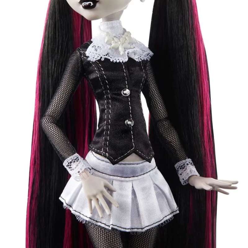En esta edición “Monstruo-secretos”, el pelo extralargo de la muñeca Draculaura™ está peinado en dos coletas bajas y realzado por sus características mechas rosas, por supuesto.