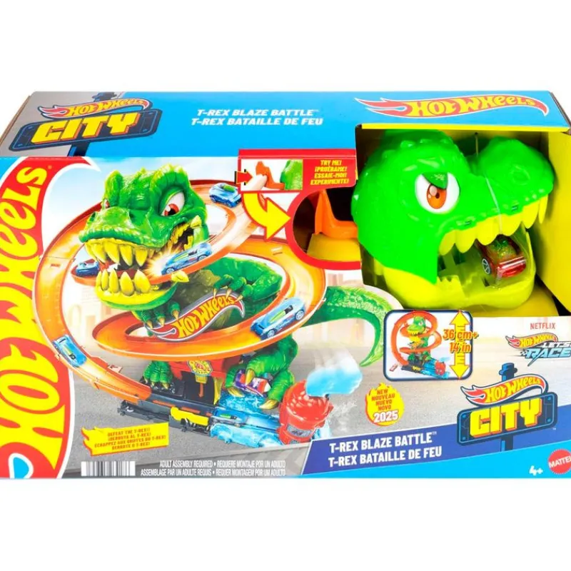 Lucha contra un hambriento T-Rex que ha invadido la estación de bomberos de Hot Wheels City con este conjunto interactivo.