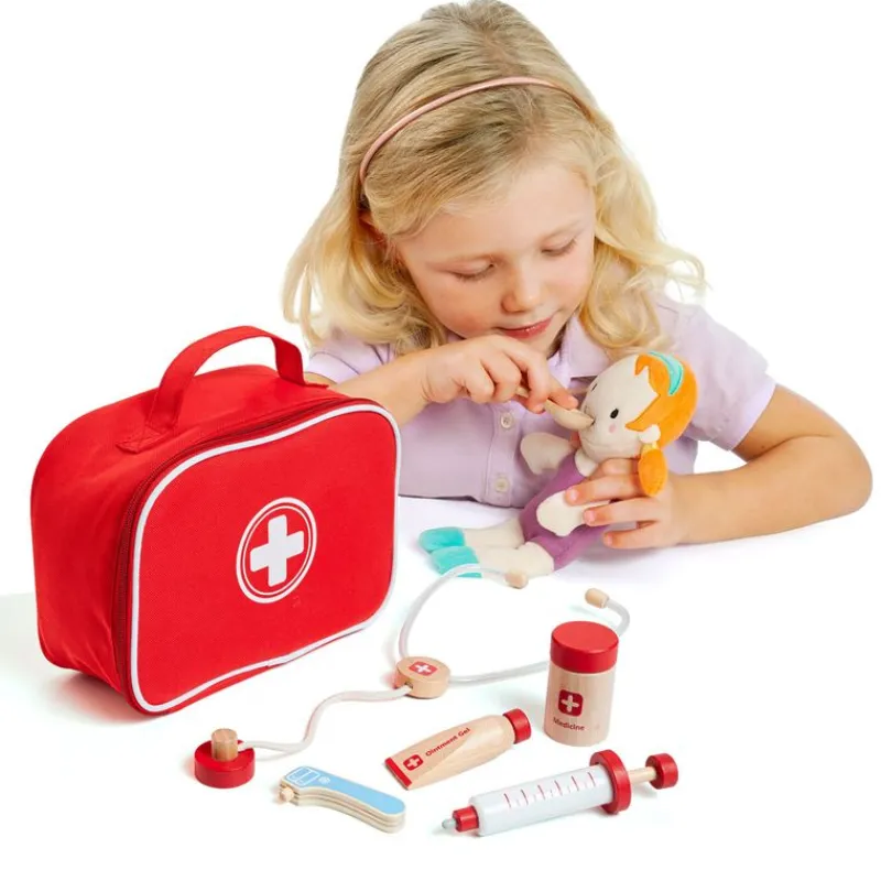 En el interior encontrarás una jeringuilla, un termómetro, un bote de medicina, una cuchara, una crema y un estetoscopio.