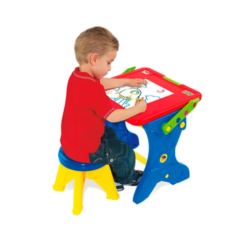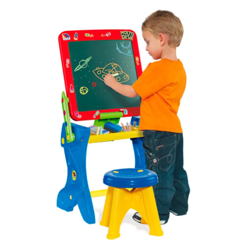 Nuevo pupitre y pizarra 2 en 1 de Molto. Si levantas el tablero puedes utilizarlo como una pizarra de tiza y, al bajarlo, se transforma en un cómodo pupitre. Cuenta con un cajón donde poder guardar tus objetos de papelería. Incluye 10 tizas, 1 goma, 1 sacapuntas, 1 lápiz, 1 borrador y 1 taburete independiente. Medidas aproximadas en modo pizarra 90 x 49 x 36 cm.