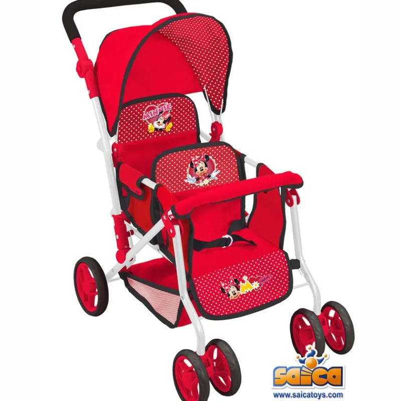 Silla de tipo gemelar con la que podrás llevar a tus dos muñecos bebé a todas partes contigo. Sus dimensiones son de 44 cm x 32 cm x 68 cm aproximadamente. No se pliega.