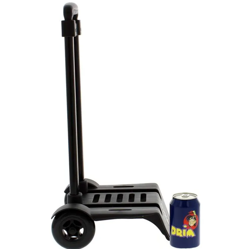 Trolley plegable, en color negro, para adaptar mochilas escolares. Cuenta con una estructura de aluminio resistente, arandelas de fijación en la base, base de PVC con refuerzo y doble eje con capa antioxido. Dispone, además, de un sistema de fácil plegado y de unas ruedas con protección que ofrecen mayor resistencia al rodaje. Es ideal para colocar tu mochila y no tener que cargar con el peso de los libros a la espalda. NO incluye mochila.