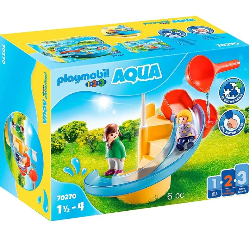 Tobogán Acuático de la colección Playmobil 1.2.3 con el que podrás deslizar las figuras vertiendo agua con el cazo que incluye en el recipiente próximo al asiento.