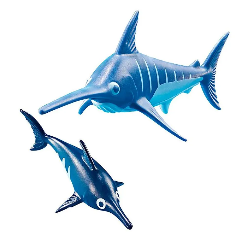 Completa tu Acuario de Playmobil con estas figuras de un pez espada y su bebé. El pez espada adulto flota en el agua. Recomendado a partir de 4 años.
