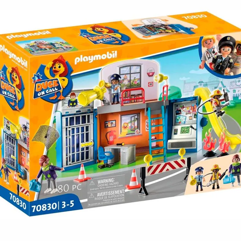 Centro de operaciones móviles de la colección Playmobil Duck on Call. Dispone de estación de bomberos, estación de policía y 2 personajes de Duck on Call. Contiene una caja plegable con oficina, una celda, una pistola de red y un tobogán. Recomendado a partir de 3 años.