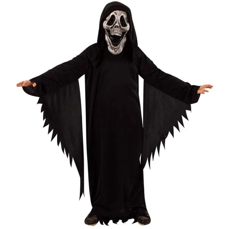 Disfraz de fantasma skull compuesto de una capa con mangas largas y una terrorífica máscara. No contiene calzado.