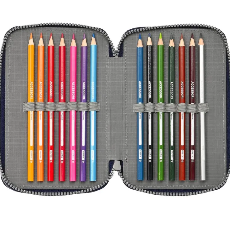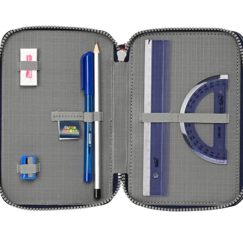 Plumier con diseños inspirados en el videojuego Super Mario. En el interior encontrarás 3 compartimentos en los que podrás almacenar tu material escolar. Contiene lápiz, bolígrafo, reglas, goma, sacapuntas, lápices de colores y rotuladores. Su tamaño es de 19 cm x 12 cm x 5 cm aproximadamente.