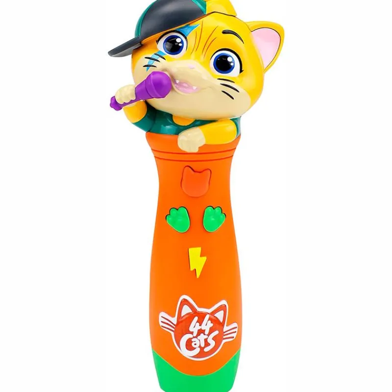 Micrófono de mano con diseños inspirados en la serie de animación 44 Cats. Te permitirá grabar tu voz hasta 60 segundos. Reproduce canciones de la serie de animación y efectos de luces. Funciona con pilas incluidas (pilas de demostración). Recomendado a partir de 3 años.
