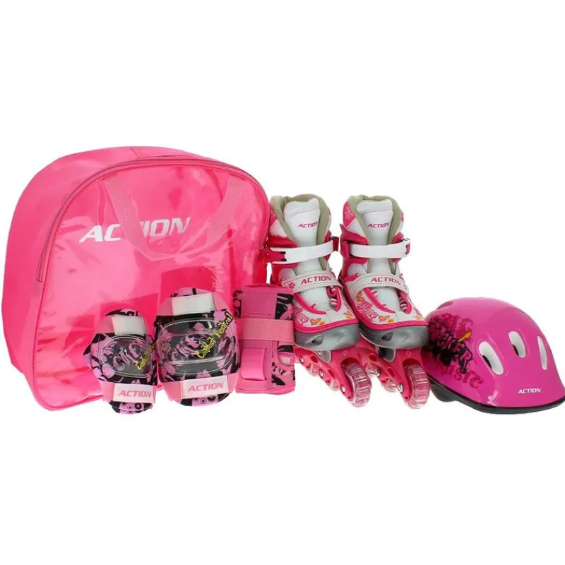 Disfruta haciendo un poco de ejercicio con estos patines en línea extensibles, en color rosa. El set incluye, también, 1 casco, protecciones y 1 mochila para guardar todos los accesorios y los patines y poder llevarlos a cualquier parte. Talla 39-42.