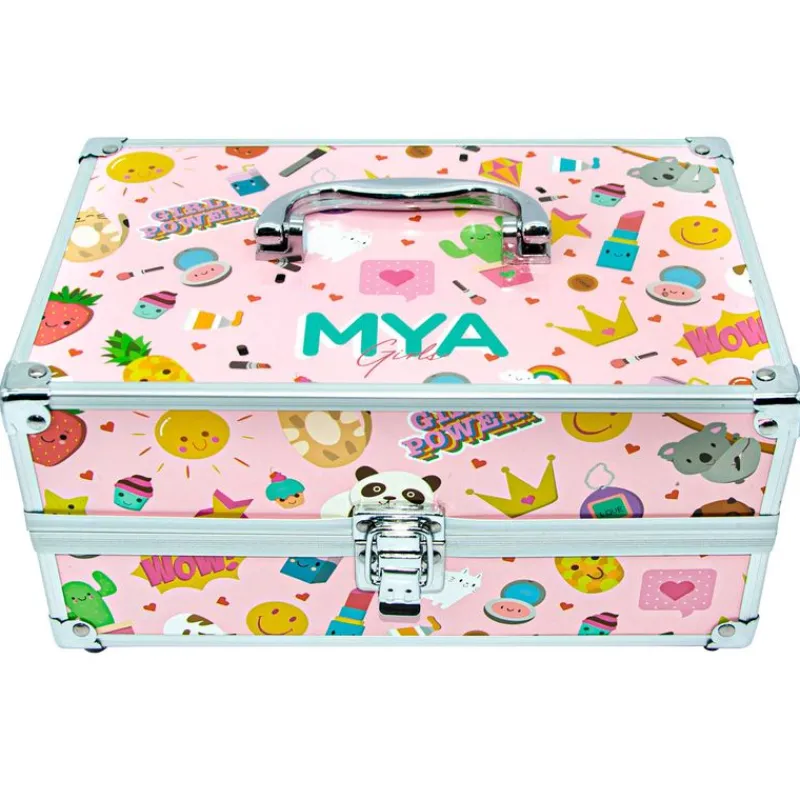 Maletín con pisos abatibles en los que encontrarás sombras, brillos de labios, esmalte de uñas, colorete y aplicadores. Gracias al asa que incluye podrás llevarla a todas partes contigo.