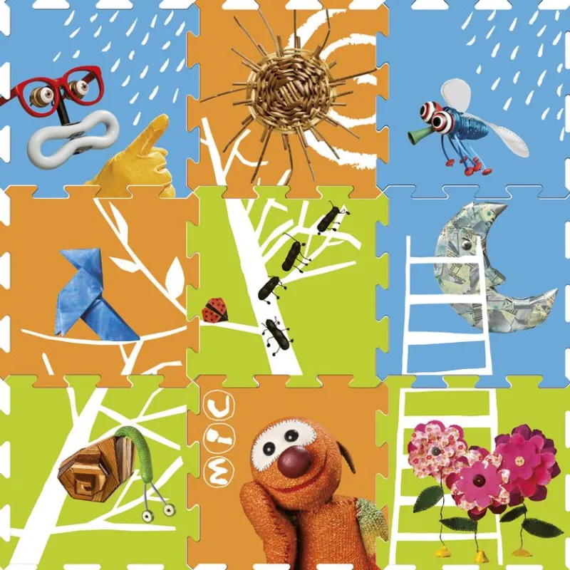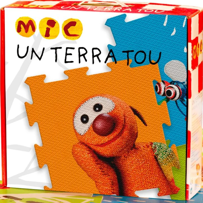 Alfombra de losetas con diseños inspirados en los personajes de la serie infantil, Mic. El pack contiene 9 piezas de 32 cm x 32 cm cada una. Fabricadas en goma EVA.