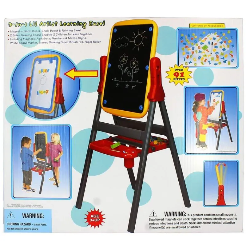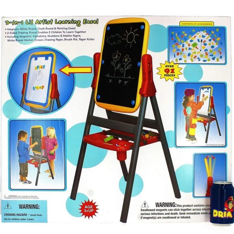 Fantástica pizarra 3 en 1 con la que podrás dibujar con rotuladores borrables, dibujar con tizas y enganchar las letras y los números imantados. Incluye letras y números magnéticos. En el lado imantado es en el que se puede pintar con rotulador, pero debe ser un ROTULADOR ESPECIAL para pizarras vileda. También podrás colocar folios, sujetados por las pinzas incluidas, para pintar con colores. Incluye más de 90 piezas entre las que encontrarás números y letras imantadas, 1 borrador o 1 rotulador especial vileda.