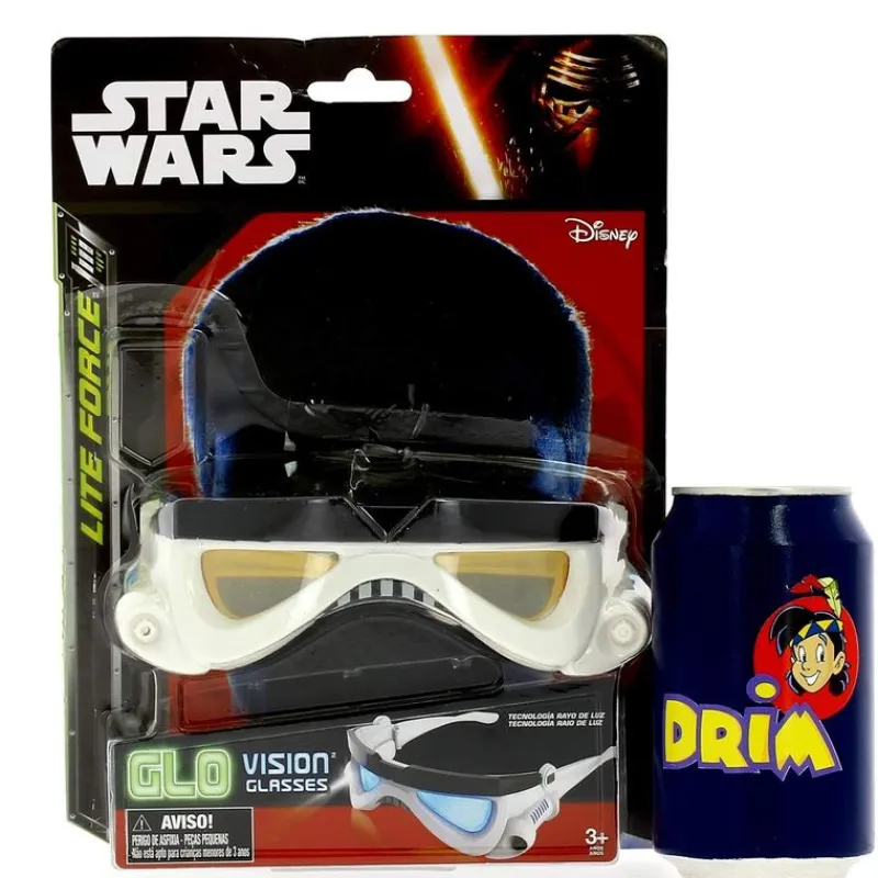 Deja que la fuerza te acompañe con estas gafas de visión nocturna de la saga de películas Star Wars. Las gafas recrean una parte del casco de los Stormtroopers y tienen una pequeña linterna en un lateral con las que podrás iluminar las habitaciones más oscuras. Tienen un acabado metálico y se adaptan perfectamente. Funciona con 3 pilas LR44 incluidas (pilas demostración).