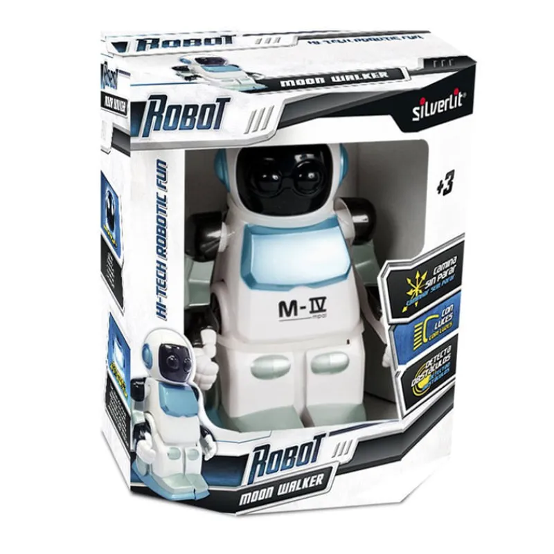 Espectacular robot de 15 cm que se mueve sin parar, camina, mueve la cabeza y los brazos. Tiene un sensor que le permite detectar los obstáculos. Equipado con luces que parpadean.