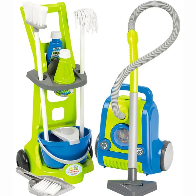 Con este completo set de limpieza infantil podrás jugar a dejar la casa bien limpia. Pasa el aspirador para quitar el polvo del suelo y luego barre y friega para conseguir un suelo bien limpio y brillante. Con este juguete los pequeños pueden imitar a los mayores en las tareas de limpieza del hogar y aprender acciones que realizan los mayores. El set incluye 1 aspirador, 1 carito de limpieza, 1 escoba grande, 1 fregona, 1 cubo, 1 escoba pequeña, 1 recogedor y 2 botes (vacíos) de detergente.