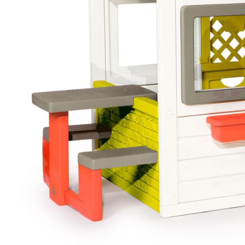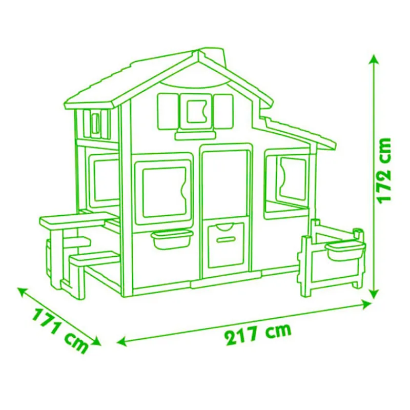 Casita de jardín muy espaciosa que consta de varios espacios de juego: casa, un pequeño sitio para hacer un picnic, jardín y un pasaje secreto. La casa está muy bien equipada con 2 bancos y una mesa y un timbre en la puerta principal. La fachada está adornada con diferentes dibujos de animales. Fabricada en plástico resistente, cuenta con una estructura estable y fuerte con un tratamiento anti rayos UV para no perder los colores. Medidas aproximadas de la casa: 172 (alto) x 217 (ancho) x 171 (fondo).