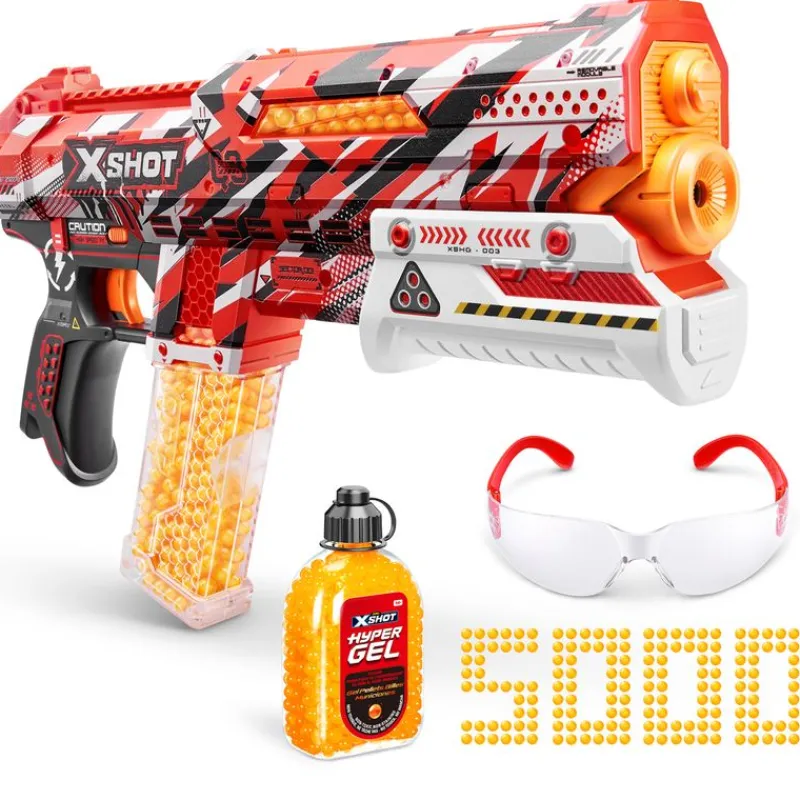 Pistola de la colección X-Shot Hyper Gel Blaster que puede disparar bolas de gel a velocidades de hasta 220 km/h. Podrás disparar en modo completo o semiautomático. Con un cargador con capacidad para 100 bolas de gel. Incluye 5000 bolas de gel y gafas de seguridad. Recomendado a partir de 14 años.